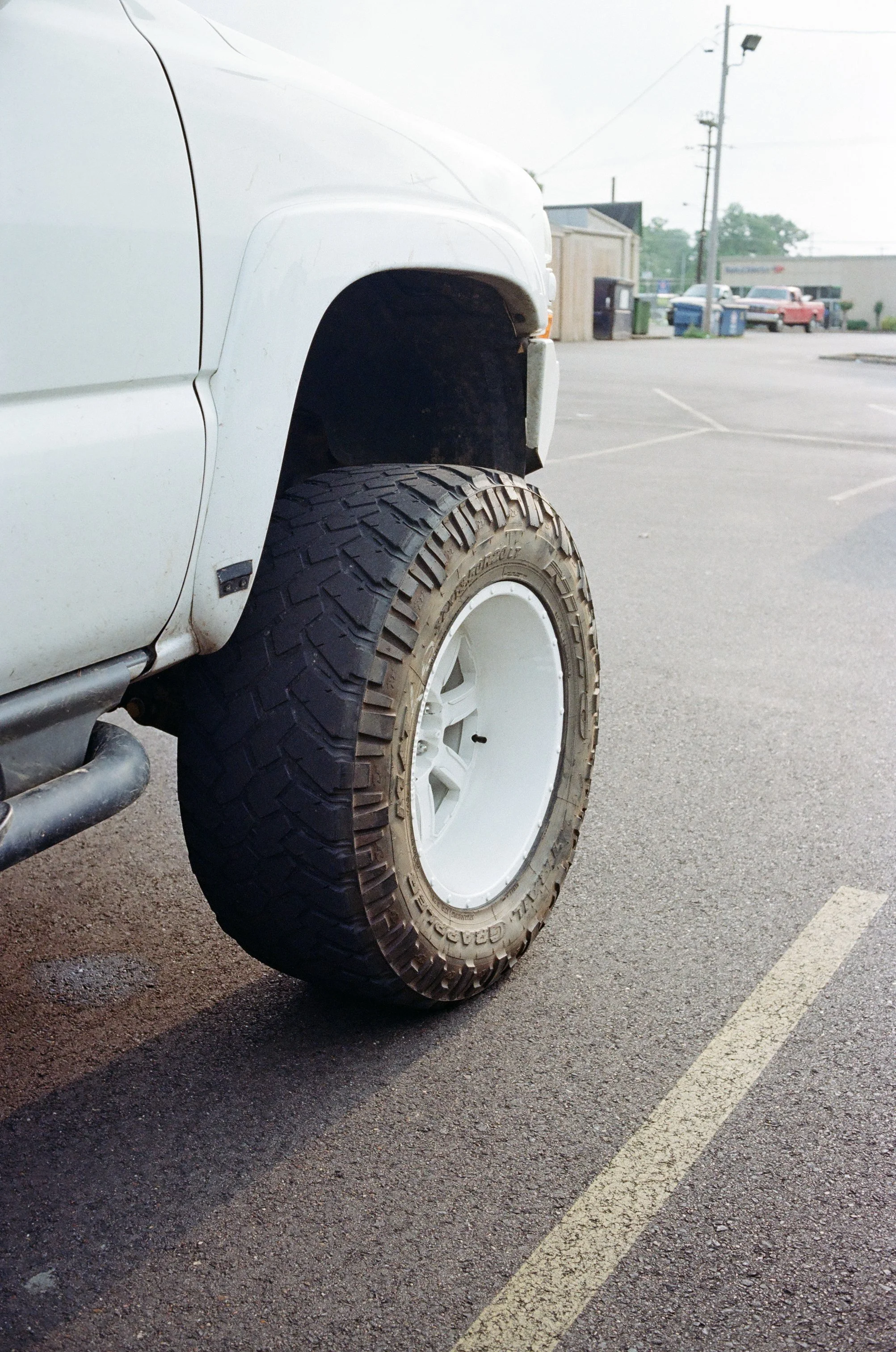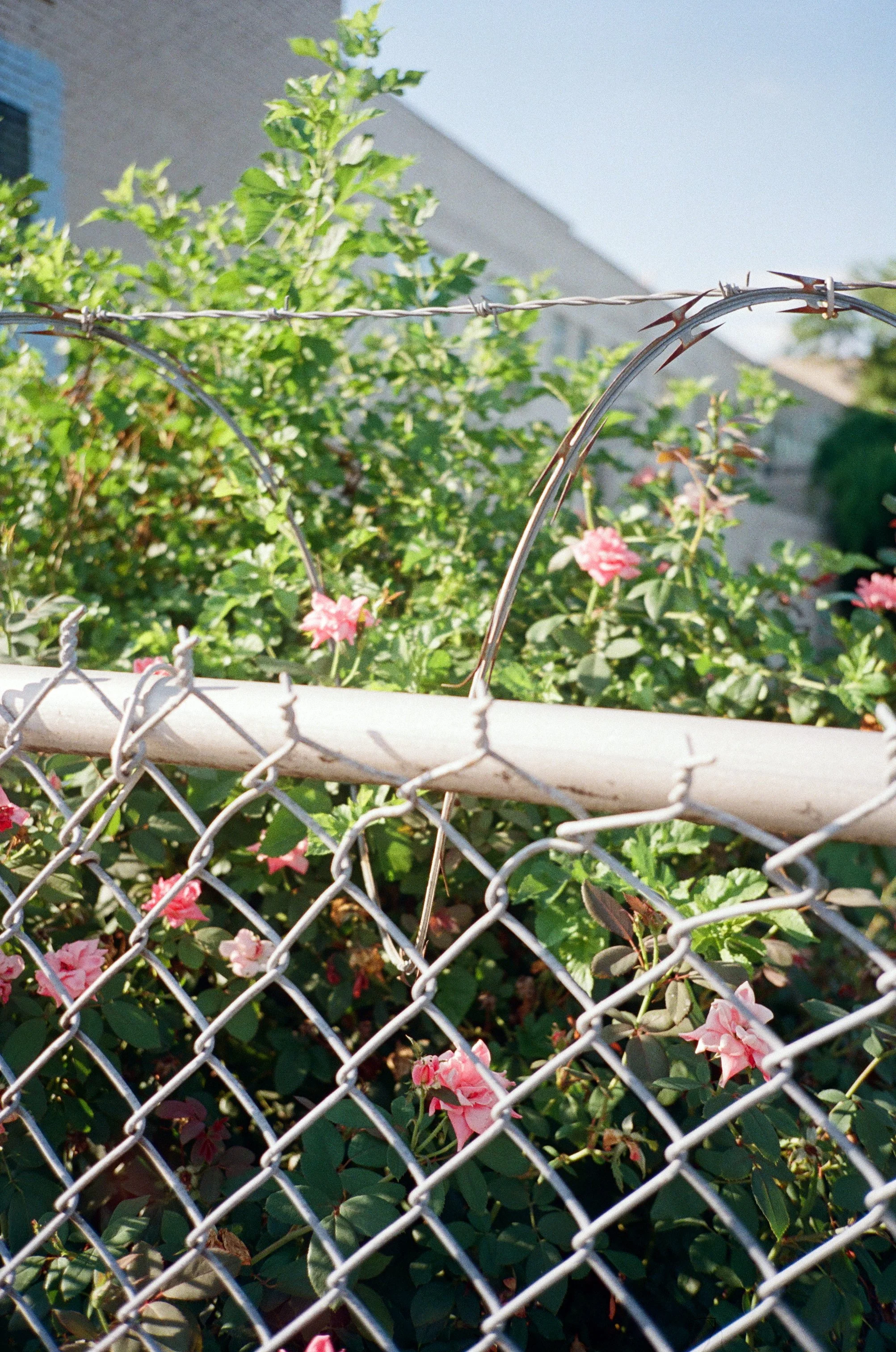 Image of three crosses on a soccer field. The nearest goal is in the foreground. The crosses are place 20 feet towards the center of the field. The other goal is in the background in front of three trees - misty morning - film photography